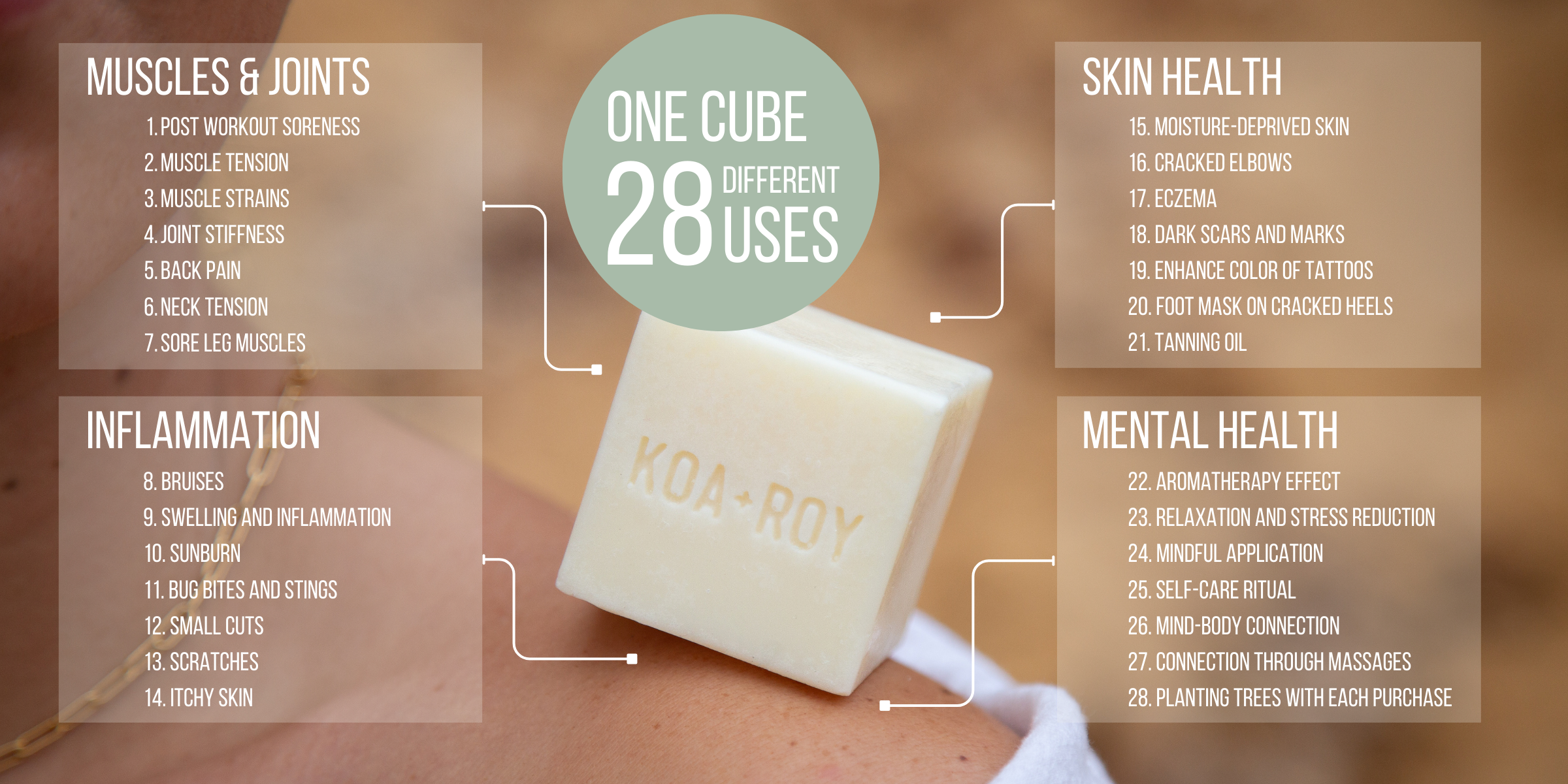 Your body & mind work around the clock and need some special treatment as much as they need a healthy diet, fresh air, and frequent exercise. Massaging your body with KOA+ROY body care cubes will not only recharge you, but also provide a sense of relief due to the combined powers of the natural ingredients the cubes have been crafted with.